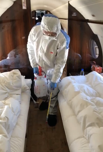 在客舱消毒方面,金鹿公务倍加重视并不断升级。在北京、上海、深圳都有专业的清洁团队负责航前、航后、过站、停场时的客舱深度消毒,覆盖客舱表面、厨卫重点区域、高频接触区、舱内缝隙等,绝不留一个死角,严谨有序的消毒程序与工艺,严格细致的验收标准,专业领先的消毒工具,无毒、无味、无腐蚀、长效抑菌的消毒制剂,让客户乘机时更加安心。